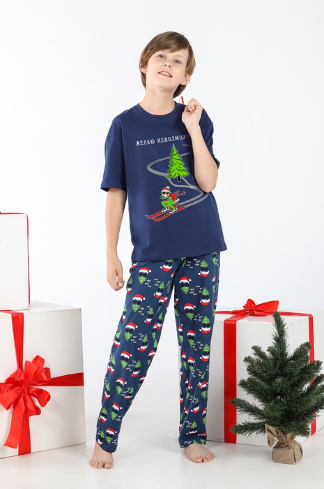 Костюм для мальчика, состоящий из футболки и брюк.Футболка - из гладкокрашеного полотна с принтом на детали переда, классического покроя, с короткими втачнвыми рукавами, удлиненными плечевыми швами и горловиной овальной формы, обработанной втачной планкой. По шву втачивания планки в горловину настрочена отделочная строчка. Нижние срезы рукавов и изделия обработаны швом вподгибку. Брюки - из полотна с набивным рисунком, длинные, на притачном поясе с эластичной тесьмой внутри и карманами в боковых швах. Нижние срезы обработаны швом вподгибку.