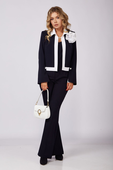Настоящее произведение искусства!!! Уверенность, элегантность, этого костюма делает его идеальным выбором для важных деловых встреч, корпоративных мероприятий и незабываемых вечерних выходов. Изысканный комплект тройка выполнен из качественной стрейчевой ткани. Топ облегающего силуэта с рельефами по полочке, по спинке выточки и потайная молния в среднем шве. Брюки клёш от колена с за утюженым кантом, которые подчеркнут вашу утонченность и изысканность. Застежка молния по переду, по бокам прорезные карманы, пояс со шлевками и эластичной лентой по бокам. Жакет "BLAZER" без застежки на подкладке, рукав втачной расширенный к низу с декоративной шлицей. Изящность комплекту придает контрастная отделка воротника, планок, разреза шлицы и съемного декоративного цветка ручной работы подчеркнет вашу неотразимость и безупречный вкус.