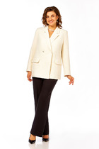Жакет прямого силуэта. Горловина обработана воротником пиджачного типа. Рукава втачные длинные. Спереди прорезные карманы в рамку с клапаном. Жакет на притачной подкладке. Длина по спинке – 75 см, длина рукава 62 см. Отлично сочетается с брюками и жилетом из такого же материала.