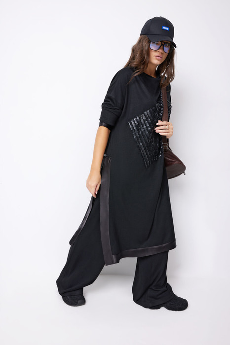 Костюм женский, состоящий из туники и брюк. Туника прямого силуэта, по спинке воротник притачная стойка, а по переду цельнокроеная стойка, линия плеча спущена, рукав втачной, заканчивающийся манжетой с открытым срезом из отделочной ткани. По разрезу и низу туники притачная планка с открытым срезом из отделочной ткани. По переду настрачной декоративный элемент. Брюки прямого силуэта типа "палаццо", по передней части боковые карманы, пояс притачной с резинкой по кругу.