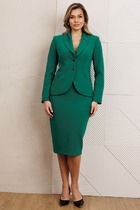 Комплект женский, состоящий из рубашки и юбки. Рубашка с длинным цельнокроеным рукавом, заканчивающимся притачной манжетой (на застежку пуговицу). Воротник стояче-отложной. Перед рубашки с застежкой на планку, петли и пуговицы. Перед с накладными карманами. В боковых швах разрезы. Юбка прямого силуэта, длинная, состоящая из двух видов ткани. Выполнена, как имитация двойной юбки. Верх юбки на обтачке, застежка - молния в среднем шве спинки. Нижняя юбка с высокими боковыми разрезами.