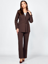 Комплект женский, состоящий  из платья и кардигана. Платье А-образного силуэта, на подкладке. По переду средний шов, переходящий в волан с разрезом. По спинке средний шов с окантованным  разрезом, со шнурками. В боковых швах карманы и окантованные разрезы со шнурками. Воротник по спинке - цельнокроеная стойка, переходящая в V-образный вырез по переду. Низ изделия разноуровневый, фигурный. Кардиган А-образного силуэта. Выполнен из сетки. Рукав втачной, длинный, расширенный. В комплекте украшение - брошь.