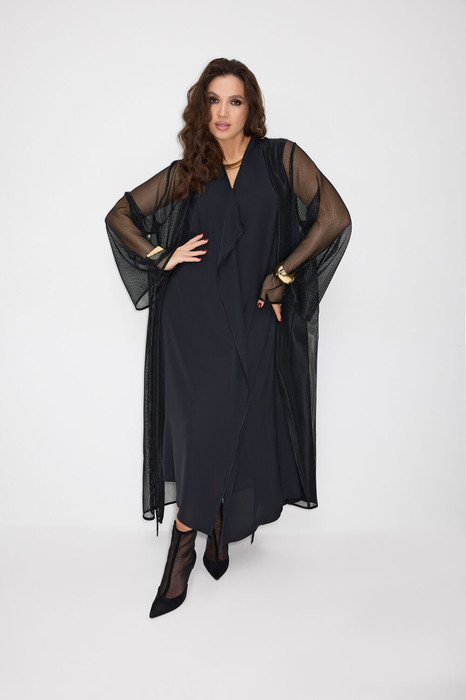 Комплект женский, состоящий из платья и кардигана. Платье А-образного силуэта, на подкладке. По переду средний шов, переходящий в волан с разрезом. По спинке средний шов с окантованным разрезом, со шнурками. В боковых швах карманы и окантованные разрезы со шнурками. Воротник по спинке - цельнокроеная стойка, переходящая в V-образный вырез по переду. Низ изделия разноуровневый, фигурный. Кардиган А-образного силуэта. Выполнен из сетки. Рукав втачной, длинный, расширенный. В комплекте украшение - брошь.