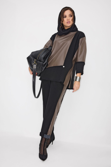 Костюм женский, состоящий из туники и брюк. Выполнен из экокожи и трикотажного полотна. Туника прямого силуэта. По переду и спинке подрезы. Линия плеча спущенная. Рукав втачной , длинный. В боковых швах разрезы. Воротник - стойка на расширенной горловине. Есть возможность носить воротник, как капюшон. Брюки прямого, зауженного к низу силуэта. По переду накладные карманы. Боковая часть брюк с лампасом. По переду имитация застежки с гульфиком. Пояс притачной, с резинкой. Свойство трикотажного полотна позволяет выполнять обработку швов с открытым срезом.