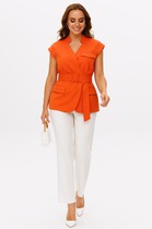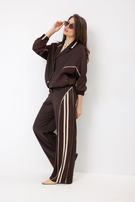 Костюм женский, состоящий из жакета и брюк. Жакет прямого силуэта со спущенной линией плеча, что обеспечивает свободное и комфортное ношение. Воротник пиджачного типа. Рукав втачной трехшовный длинный, завершающийся притачной манжетой с резинкой для удобства. Спинка с вертикальными рельефами. Боковые части спинки подрезами. Передняя часть с центральной бортовой застежкой на кнопках, боковые карманы с листочкой и декоративными подрезами. Низ жакета разноуровневый. По низу и боковым частям спинки притачные планки с резинкой. Жакет на подкладке для комфортного ношения. В брюках прямой силуэт. Брюки на притачном поясе с резинкой и кулисой. Передняя часть брюк с имитацией гульфика, что добавляет визуальных линий. В боковых участках расположены фигурные вставки с декоративными элементами в виде лампас. Декоративные канты, выполненные из отделочной ткани, украшают боковые вставки и придают завершенность образу. Комфортный и стильный женский костюм, выполнен из двух видов ткани: классической костюмной и элегантной сатиновой.