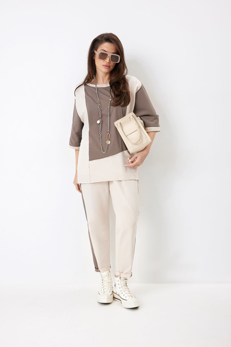 Костюм женский, состоящий из туники и брюк, выполненных из хлопка и трикотажного полотна, что обеспечивает комфорт и приятные тактильные ощущения. Туника прямого силуэта с подрезами по переду и спинке имеет цельнокроенный рукав, завершенный планкой. Вырез горловины с притачной планкой. В боковых швах расположены разрезы, а на спинке — декоративная нашивка. Брюки прямого силуэта, зауженного к низу, с накладными карманами по переду и лампасами по боковым частям. Передняя часть брюк с имитацией застежки с гульфиком. Пояс притачной с резинкой, что обеспечивает хорошую посадку и удобство. Свойство трикотажного полотна позволяет выполнять обработку швов с открытым срезом. Такой костюм идеально сочетает стиль, комфорт и практичность.