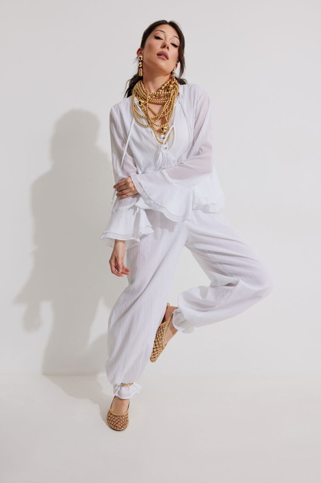 Комплект женский, состоящий из туники и брюк. Туника А-образного силуэта. Спинка с подрезами и воланами. Перед двойной с подрезами и воланами. Вырез горловины V-образный с завязками, навесными петлями и пуговицами. Рукав втачной длинный, оканчивающийся воланами. Брюки типа "палаццо" на хлопковой подкладке. Пояс притачной с резинкой по боковым и задней частям.