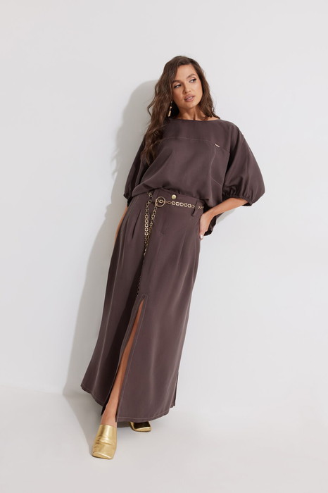 Комплект женский, состоящий из укороченного, свободного блузона и юбки в силуэте А. Блузон с горизонтальными подрезами по переду и спинке, имеет цельнокроеный рукав, собранный по низу на резинку, круглый воротник и накладной карман на левой части переда. Блузон с разрезами в боковых швах, а низ оснащен кулисой со шнуром для регулировки объема. Юбка прямого А-силуэта. Заднее полотнище с резинкой по поясу, средним швом, талиевыми вытачками и фигурными накладными карманами. Перед юбки с разрезом в среднем шве, складками и боковыми карманами с листочками. Застежка на молнию и кнопку, по поясу расположены шлевки из основной ткани, а в боковых швах имеются разрезы. Комплект выполнен с отделочными строчками, подчеркивающими качество швов, и идеально подходит для повседневных и деловых образов, сочетая комфорт и стиль.