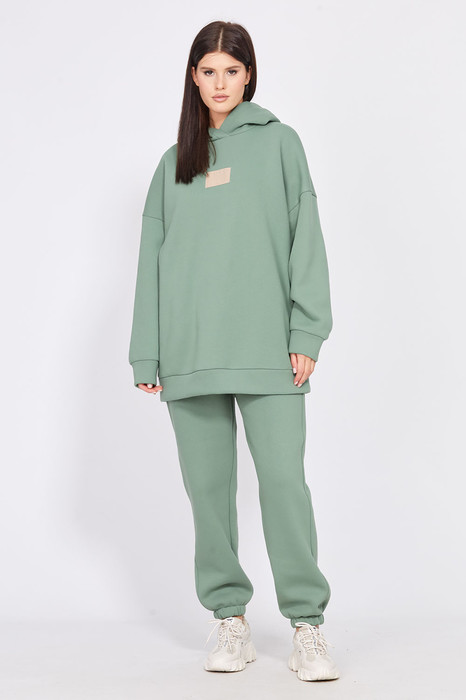 Комплект: джемпер + брюки. Комплект выполнен из однотонного трикотажного полотна на флисе. Джемпер прямого силуэта, покроя оверсайз,  длиной ниже линии бедер. Перед и спинка цельные, перед декорирован настрочной нашивкой из натуральной кожи. Плечевой шов спущен. Горловина округлой формы, обработана капюшоном. Рукав одношовный, на притачной манжете. В боковых швах карманы. Низ джемпера на манжете. Брюки на притачном поясе с эластичной тесьмой, заужены к низу, в боковых швах карманы. Низ брюк на манжете с эластичной тесьмой.