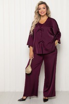 Костюм женский 2х предметный выполнен из бархатной ткани -Велюра, джемпер с приспущенным длинным рукавом. Горловина округлая, по переду расположена дизайнерская аппликация с прозрачными вставками. Брюки палаццо с высокой посадкой на притачном поясе с резинкой, по переду брюк расположены глубокие складки. Застежка - молния в боковом шве.