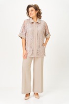 Костюм 3-х предметный, состоит их рубашки, юбки, галстука. Выполнен из костюмной ткани. Рубашка прямого кроя без подкладки, по полочке расположены накладные декоративные элементы и карманы с клапаном. спинка с отрезной кокеткой и таллиевыми выточками. Воротник отложной на стойке, рукав втачной 7/8. Юбка изделия на притачном поясе с резинкой, застежка потайная молния, по низу юбки расположена шлица, юбка с подкладкой.
