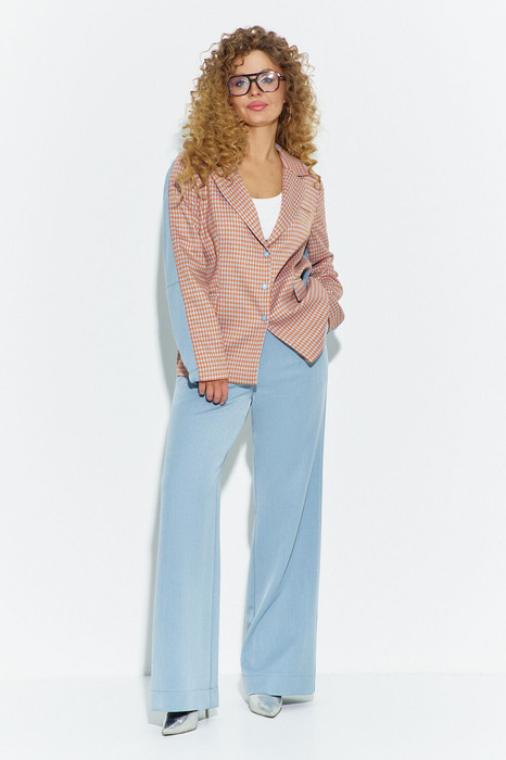 Костюм женский, состоит из жакета и брюк, выполнен в сочетании костюмных тканей. Жакет свободного кроя, не приталенный. Полочка жакета выполнена в стиле классического жакета с прорезными карманами - рамками и английским воротником (отложной воротник с лацканами). Спинка жакета с отрезной кокеткой выделенной ярким кантом, по низу жакета частичная эластичная тесьма. Рукав втачной длинный, по задней (джинсовой) части рукава расположена резинка. Брюки классического кроя, прямые от бедра, с высокой посадкой, в боковых швах расположены функциональные карманы. Пояс в брюках втачной с резинкой, застежка молния на гульфике и петля-пуговица