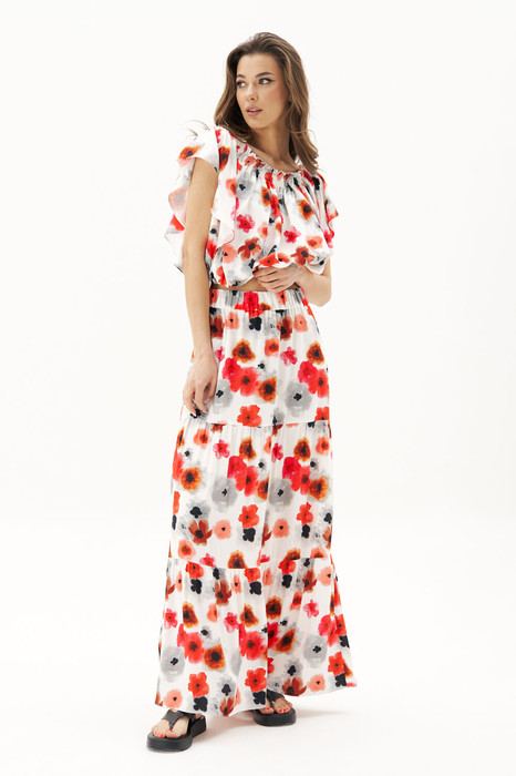 Юбка А-образного силуэта, состоит из трёх горизонтальных воланов с лёгкой сборкой и на эластичном поясе.