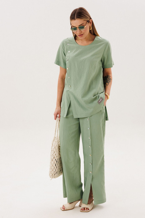 Брюки свободные, широкие, на эластичном поясе с наклонными карманами. Левая передняя половинка брюк со сквозной шлицей и пуговицами.