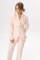 Жилет свободный с центральной застёжкой на тесьму-молнию, кулисой чуть ниже линии талии, неширокой баской. Полочки с отрезной кокеткой и прорезным карманом с листочкой. Кулиса с эластичным шнуром и фиксаторами.