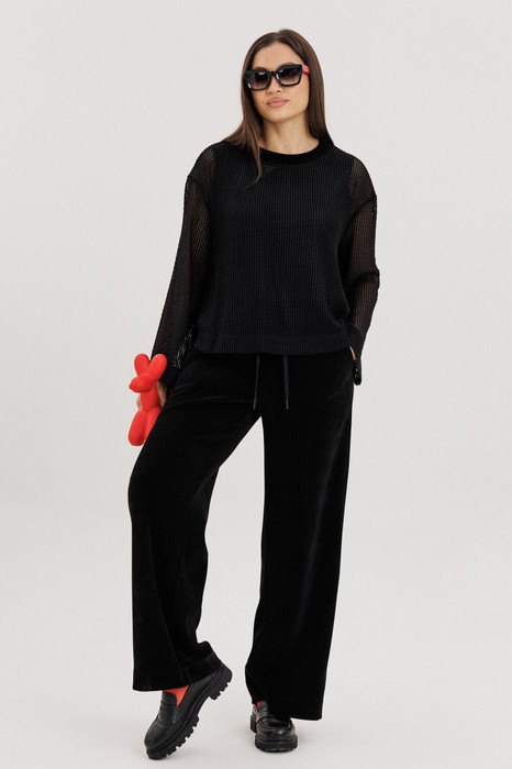 Рукав слегка расширенный к низу. Обтачка горловины из отделочного текстурного трикотажа.