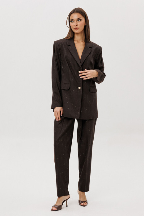 Жакет свободного расширенного силуэта, втачного покроя с центральной застёжкой и классическим английским воротником. Полочка с отрезным бочком, нагрудной вытачкой и прорезным карманом с клапаном. Спинка с центральным швом, шлицей и отрезным бочком. Рукав двухшовный с отлетной шлицей.