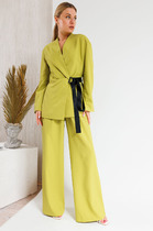 Комплект женский нарядный "Санда" летний для выхода и повседневного образа (блузка, брюки, топ). Блузка прямого силуэта, застежка однобортная, на кнопки, по горловине стойка, по полочке - нагрудная выточка. Спинка в блузке без шва, рукав одношовный 7/8. Низ блузки и рукава обработан швом в подгибку с закрытым срезом. Брюки - прямого силуэта, в боковом шве - карманы, пояс на резинке, низ брюк обработан швом в подгибку, с закрытым срезом. Топ с печатью на полочке, изготовлен топ из трикотажной ткани, полуприлегающего силуэта. По полочке топа - нагрудная выточка, проймы и горловина обработаны планкой, низ изделия обработан на распошивалке.