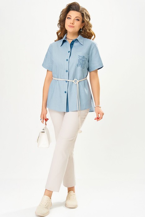 Стильные детали делают блузку особенной: накладной карман с декоративной печатью на левой полочке добавляет оригинальности, а спинка с изящным принтом подчеркивает индивидуальность модели. Втачные одношовные рукава завершаются обработанной отделочной тканью обтачкой, создавая утонченный акцент. Завершает образ съемный пояс, позволяющий варьировать посадку и силуэт.