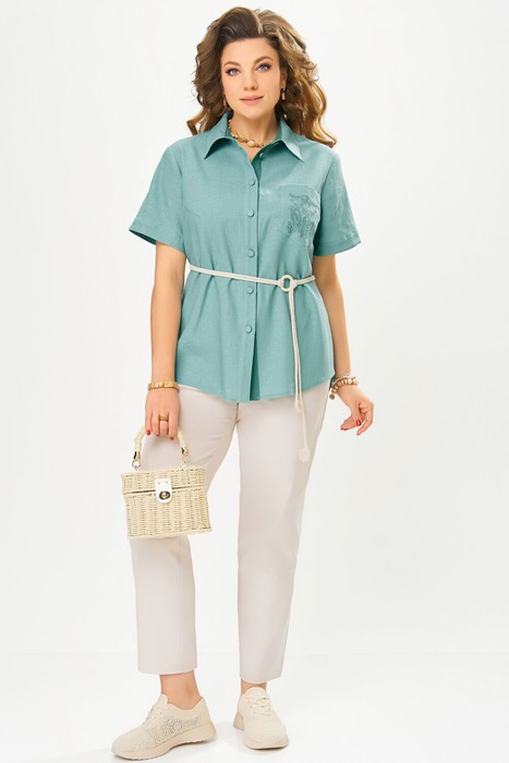 Стильные детали делают блузку особенной: накладной карман с декоративной печатью на левой полочке добавляет оригинальности, а спинка с изящным принтом подчеркивает индивидуальность модели. Втачные одношовные рукава завершаются обработанной отделочной тканью обтачкой, создавая утонченный акцент. Завершает образ съемный пояс, позволяющий варьировать посадку и силуэт.