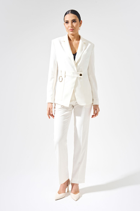 Женский костюм полуприлегающего силуэта на подкладке, состоящий из жакета и брюк. Изделие выполнено из костюмной ткани с содержанием вискозы. Жакет  имеет ассиметричную линию низа и функциональный накладной карман на правой полочке с декоративным кольцом. Воротник пиджачного типа, рукава втачные, застегивается на петли и пуговицы. Брюки полуприлегающего силуэта заужены к низу; пояс притачной с  резинкой в боковых швах  для лучшего прилегания, застежка на молнию петлю и пуговицу.