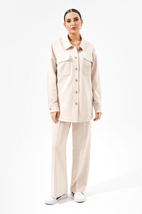 Костюм женский свободного силуэта, состоящий из рубашки и брюк, выполнен из футера двухнитки класса "пенье". Рубашка с накладными функциональными карманами по переду, рукава со спущенной линией плеча, воротник рубашечный, застежка на петли и пуговицы. Брюки прямого кроя с завышенной линией талии и карманами в боковых швах, пояс притачной полностью на резинке.