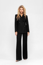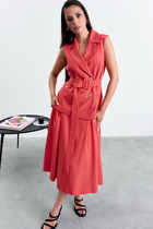 Костюм женский из трикотажной ткани. Жакет имеет V образный вырез. Застёгивается на 5 петель- пуговиц.Спереди накладные карманы. Жакет завязывается на пояс.