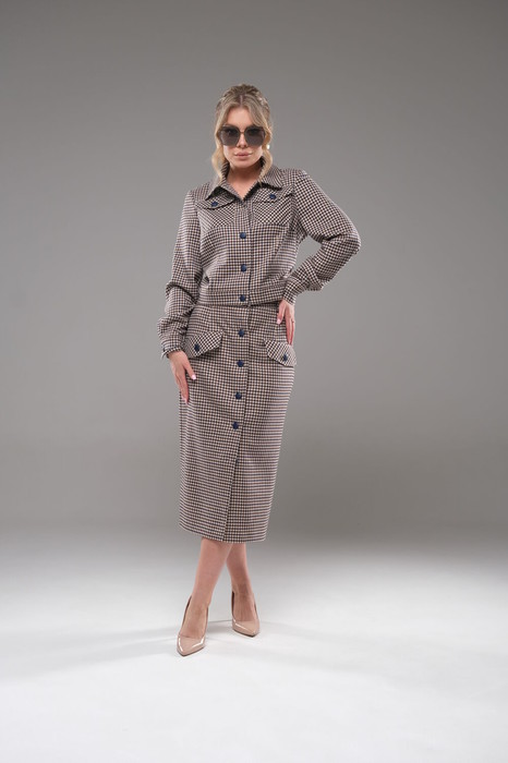 Костюм женский жакет+ юбка приталенного силуэта, выполнен из текстильного полотна костюмно- плательной группы. Перед с нагрудной вытачкой идущей от бокового шва, накладными карманами с клапаном. На планке расположены 5 пуговиц. Спинка со средним швом. По низу жакета обработан пояс. Воротник стояче отложной. Рукава одношовные заканчивающиеся манжетой. Юбка прямая, на поясе спереди застёгивается на пуговицы. По переду расположены накладные клапаны. На клапанах расположены декоративные пуговицы в цвет основных.