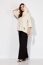 Очень стильный, удобный комплект состоящий из блузки и брюк, выполнен из 100% льна двух цветов. Блузка прямого силуэта с коротким рукавом который украшен патой, застёгивающий на петлю и пуговицу .Авторская вышивка в народном стиле, очень украшает данное изделие.