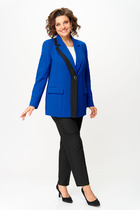 Костюм состоит из жакета и брюк из джинсовой хлопковой ткани. Жакет полуприлегающего силуэта с воротником пиджачного типа. Застежка однобортная на две пуговицы. Перед с талиевой вытачкой, рельефом и декоративным клапаном. Спинка с рельефами из проймы и средним швом. Рукав втачной двухшовный. Брюки расширеные книзу на притачном поясе. По поясу настрочены шлевки. По передним и задним частям брюк вытачки. На задних частях брюк настрочены карманы. Карманы, вытачки, пояс, низ брюк отделаны отделочной строчкой. Длина жакета - 68см, длина рукава жакета - 60 см, длина брюк с учетом пояса -107 см