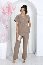 Костюм состоит из жакета и брюк из хлопковой ткани. Жакет полуприлегающего силуэта с воротником пиджачного типа. Застежка однобортная на две пуговицы. Перед с талиевой вытачкой, рельефом и декоративным клапаном. Спинка с рельефами из проймы и средним швом. Рукав втачной двухшовный. Брюки расширеные книзу на притачном поясе. По поясу настрочены шлевки. По передним и задним частям брюк вытачки. На задних частях брюк настрочены карманы. Карманы, вытачки, пояс, низ брюк отделаны отделочной строчкой. Длина жакета - 68см, длина рукава жакета - 60 см, длина брюк с учетом пояса -107 см