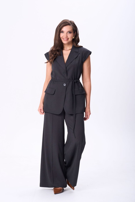 Костюм состоит из жилета и брюк, выполеных из костюмной ткани. Жилет полуприлегающего силуэта с воротником пиджачного типа. Перед с рельефами, талиевой вытачкой и декоративным клапаном. Застежка центральная однобортная на 2 петли и пуговицы. Спинка со средним швом и рельефами. Вдоль оката рукава выполнена декоративная планка. К жилету прилагается тонкий пояс из основной ткани. Брюки расширеные книзу с притачным поясом. Спереди застежка гульфик на молнии и с петлей и пуговицей по поясу. По задней частям брюк вытачки. В боковых швах карманы с наклонным входом. По поясу широкие шлевки. Брюки со срелками застроченными по переду и заутюженными сзади. Длина жилета - 71 см, длина брюк с учетом пояса - 109 см.