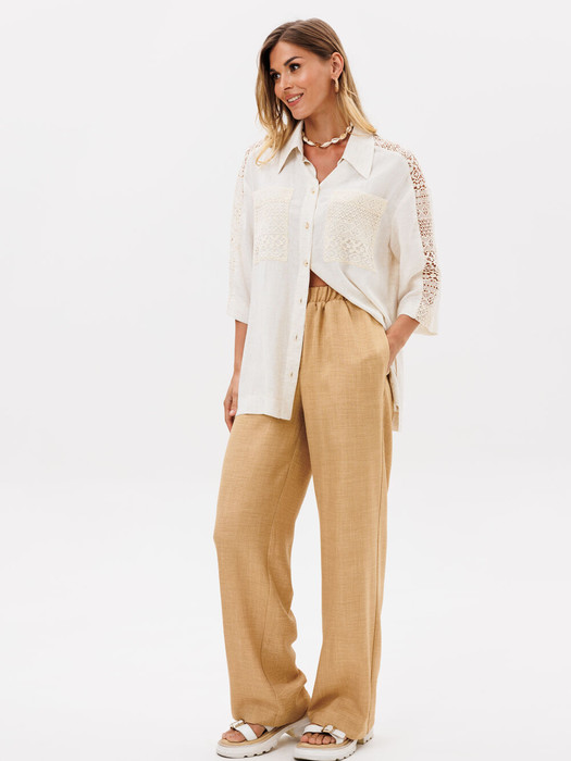 Костюм сотоит из рубашки и брюк. Рубашка свободного силуэта из легкой вискозной ткани под лен. Застежка центральная на петли и пуговицы, воротник на стойке.  В боковых швах разрезы. Рукав втачной рубашечного кроя. Карманы спереди и вставка вдоль плеча и рукава выполнеы из кружева. Брюки прямые с поясом на резинке. Спереди имитация застежки гульфик. В боковых швах карманы.  Длина брюк - 109 см, длина рубашки-  71 см, длина рукава рубашки - 35 см.
