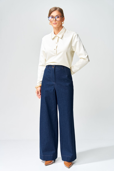 Джемпер прямого силуэта с воротником поло из плотной хлопковой ткани "двухнитка". Рукав втачной одношовный. По низу изделия, по низу рукава и по воротнику проложена отделочная строчка.  Брюки расширеные книзу на притачном поясе из джинсовой хлопковой  ткани. По поясу настрочены шлевки. По передним и задним частям брюк вытачки. На задних частях брюк настрочены карманы. Карманы, вытачки, пояс, низ брюк отделаны отделочной строчкой. Длина джемпера- 66 см, длина рукава - 60 см. Длина брюк с учетом пояса - 109 см