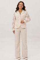 Костюм состоит из блузки и брюк. Блузка оригинальная приталенного силуэта из вельветовой ткани. Перед с подрезом под грудью, сборкой в районе груди и талиевыми вытачками. Затсежка на петли и пуговицы. Горловина V-образной формы. Спинка с талиевыми вытачками. Рукав втачной со сборкой по окату и с манжетой по низу. Манжета высокая с двумя петлями и пуговицами. Длина блузки - 63 см, длина рукава блузки - 64 см. Брюки палаццо с притачным поясом из мягкой вельветовой ткани. Спереди застежка гульфик на молнии и петлей и пуговицей по поясу. По задней частям брюк вытачки. Пояс с резинкой в боковых частях. Брюки с заутюженными стрелками. Длина брюк с учетом пояса - 109 см.