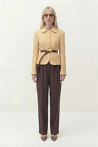 Костюм состоит из джемпера и юбки. Джемпер слегка приталенного силуэта с воротником поло из трикотажного полотна. Рукав втачной одношовный. Длина джемпера - 57 см, длина рукава - 60 см. Юбка прямого силуэта выполненная из джинсовой ткани. Передняя честь юбки с вытачками, со средним швом и застежкой гульфиком на молнии и щлицей спереди. Задняя часть юбки с вытачками. Юбка на притачном поясе с затежкой на петлю и пуговицу спереди и резинками по бокам. Длина юбки с учетом пояса - 90 см.