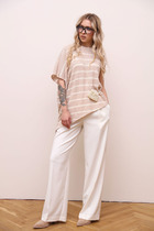 Костюм состоит из джемпера и юбки. Джемпер слегка приталенного силуэта с воротником поло из трикотажного полотна. Рукав втачной одношовный. Длина джемпера - 57 см, длина рукава - 60 см. Юбка прямого силуэта выполненная из джинсовой ткани. Передняя честь юбки с вытачками, со средним швом и застежкой гульфиком на молнии и щлицей спереди. Задняя часть юбки с вытачками. Юбка на притачном поясе с затежкой на петлю и пуговицу спереди и резинками по бокам. Длина юбки с учетом пояса - 90 см.