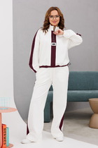 Джемпер с дизайнерскими, наклонными резами и на переде, и на спинке, выполненных из разных контрастных оттенков. Рукава визу имеют манжеты. Воротник-стойка, манжеты, низ джемпера выполнены из ткани-компаньена кошкорсе. На левом переде вышит логотип в цвет полоски. Брюки имеют современный крой и облегание, удобные карманы на передних половинка, притачной пояс и резинку внутри. Низ брюк присобран на резинку.