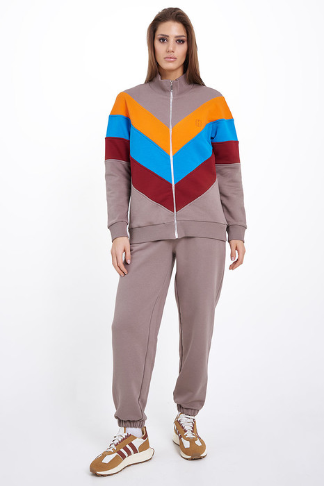 Джемпер с дизайнерскими, наклонными резами и на переде, и на спинке, выполненных из разных контрастных оттенков. Рукава визу имеют манжеты. Воротник-стойка, манжеты, низ джемпера выполнены из ткани-компаньена кошкорсе. На левом переде вышит логотип в цвет полоски. Брюки имеют современный крой и облегание, удобные карманы на передних половинка, притачной пояс и резинку внутри. Низ брюк присобран на резинку.