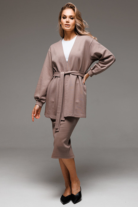Костюм Gowear из футера в стиле smart casual поможет создать в меру строгий и одновременно расслабленный образ. Костюм состоит из жакета и юбки из эластичной ткани кошкорсе. Жакет прямого силуэт, с v-образным вырезом горловины, без застежки, с отдельным поясом. На левом переде вышивка-логотип в цвет ткани. Рукав свободный, со складками, присобран на манжету. Жакет без подкладки. Юбка прямая, облегающая фигуру с разрезом на спинке. Пояс цельнокроенный с резинкой внутри.