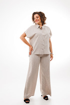 Блузка с застежкой на навесную петлю и пуговицу по горловине спинки, без воротника, с круглым вырезом горловины. По горловине спинки -вырез каелька. Рукав цельнокроенный, короткий, с отложной манжетой. По низу блузки- кулиса с завязками. Шорты прямые, без пояса. По верхнему краю шорт- шлевки. В боковых швах расположены карманы.