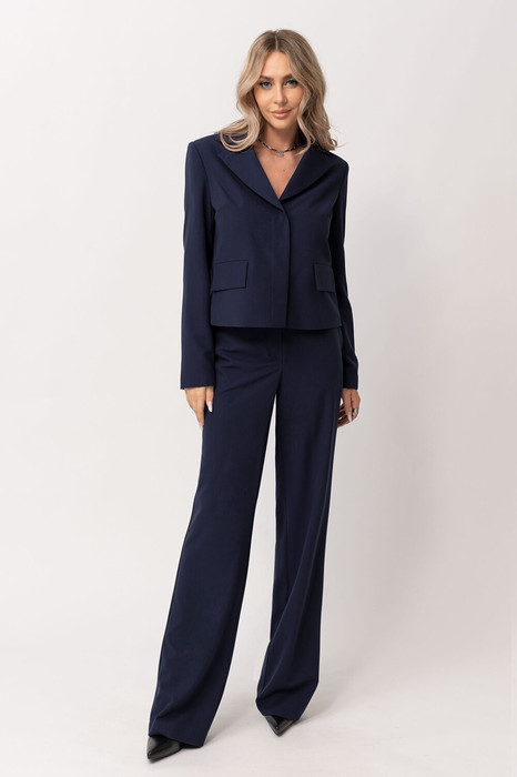Жакет прямого силуэта с центральной застежкой на пришивные кнопки, с втачным воротником и отложными лацканами пиджачного типа. По переду с нагрудными вытачками. На уровне линии талии расположены прорезные карманы с листочками. Спинка со средним швом. Рукав втачной, длинный. Брюки прямые, с отрезным поясом, застегивающимся на одну петлю и пуговицу. По спинке пояс присборен на резинку. В боковых швах расположены карманы. Застежка гульфик.
