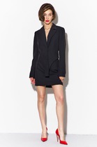 Блузка с втачным воротником с отрезной стойкой, центральной застежкой петли и пуговицы. По левой полочке на уровне груди расположен накладной карман. Спинка с отрезной кокеткой. Рукав втачной, длинный, с отрезной манжетой. Шорты прямые, с отрезным поясом, пояс присборен на резинку. В боковых швах расположены карманы. Вход в карман наклонный к боковому шву.