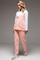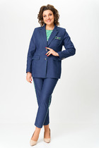 Жакет прямого силуэта с центральной застежкой на петли и пуговицы, без воротника, с круглым вырезом горловины. По переду с нагрудными вытачками. На уровне груди и линии талии расположены настрочные клапаны . Спинка со средним швом. Рукав втачной, длинный. Брюки прямые, с отрезным поясом и шлевками. В области спинки пояс присборен на резинку. На передних половинках расположены две односторонние складки и карманы. Вход в карман наклонный к боковому шву. Застежка гульфик.
