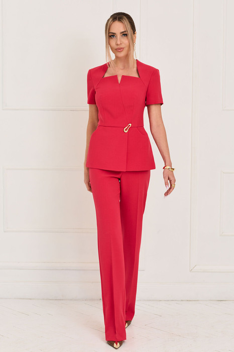Жакет с застежкой на потайную молнию в среднем шве спинки, без воротника, с фигурным вырезом горловины. Жакет с отрезной баской с запахом по переду. По верхней части переда- асимметричный средний шов, заканчивающийся разрезом по горловине, фигурная кокетка, рельефы, выходящие из проймы, талиевые вытачки. Спинка со средним швом, рельефами, выходящими из проймы, талиевыми вытачками. Рукав втачной, короткий. Брюки с отрезным поясом, на поясе расположены шлевки. Пояс в области спинки присборен на резинку. Застежка гульфик.