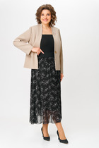 Блузон без воротника, с круглым вырезом горловины, застежкой на навесную петлю и пуговицу по горловине спинки. Перед со средним швом, фигурными рельефными швами. Спинка со средним швом, разрезом по горловине, талиевыми вытачками. Рукав короткий, втачной.