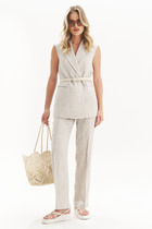 Брюки- прямого силуэта, без пояса, верхний срез брюк обработан обтачками, застежкой- гульфик. Пояс в области спинки присборен на резинку. По переду- декоративный пояс, закрепленный к брюкам петлями и пуговицами. В боковых швах расположены карманы.