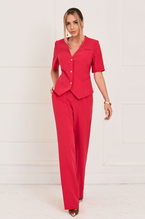Жакет с центральной застежкой на петли и пуговицы, без воротника, с V-образным вырезом горловины. По переду с талиевыми вытачками и рельефами, выходящими из проймы, прорезными карманами в рамку, расположенными на уровне линии талии. Спинка со средним швом, рельефами, выходящими из проймы. Рукав втачной, короткий. Брюки с отрезным поясом, на поясе по переду расположены декоративные пояски с пряжками. Пояс в области спинки присборен на резинку. Застежка гульфик. По боковым швам расположены карманы. Вход в карман наклонный к боковому шву.