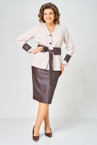 Жакет с центральной двубортной застежкой на пришивные кнопки, без воротника с отложными лацканами. По переду с рельефами, выходящими из проймы, талиевыми вытачками. Спинка со средним швом, рельефами, выходящими из проймы, талиевыми вытачками. Рукав втачной, длинный. Брюки с отрезным поясом, на поясе расположены шлевки. В боковых швах расположены карманы. Вход в карман наклонный к боковому шву. Застежка гульфик. Пояс в области спинки присборен на резинку. Костюм со съемным декоративным поясом. Декоративный пояс из кожзама, декорирован бахромой.