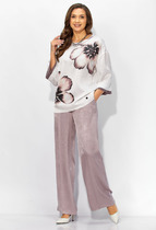 Жакет с центральной застежкой на петли и пуговицы, отложным воротником и лацканами пиджачного типа. По переду с рельефами, выходящими из плеча. Спинка со средним швом, рельефами, выходящими из проймы. В боковых швах расположены разрезы. Полочки декорированы переплетением со шнуром. Рукав втачной, длинный. Брюки с отрезным поясом, на поясе расположены шлевки. В боковых швах расположены карманы. Вход в карман наклонный к боковому шву. Застежка гульфик.